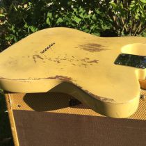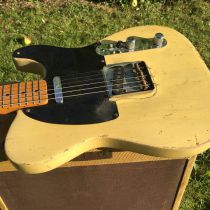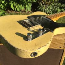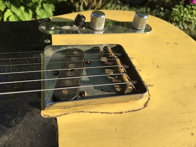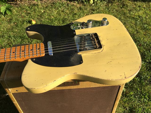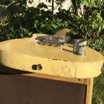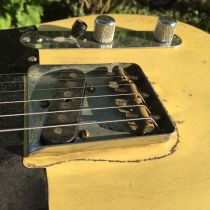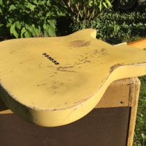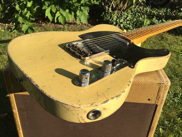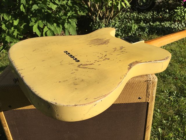 Matt hat den viel zu dicken Lack aus den Siebzigern vorsichtig abgetragen und nach einer Vorlage aus dem Blackguard-Book einen fantastischen paint-job abgeliefert. Nach reichlich Aging im Captain Guitar Shop sieht sie wieder sehr authentisch aus.