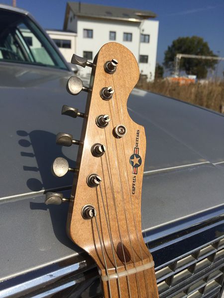 Der One Piece Maple Neck hat ein medium C-Profil und Vintage Bünde in seinem 7,25" Griffbrett. Die Captain Premium Lackierung ist hier etwas heller ausgefallen als Kontrast zum dunklen Body.